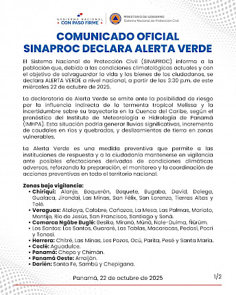 El Sistema Nacional de Protección Civil (SINAPROC), emitió una alerta verde a nivel nacional por efectos indirectos de la tormenta tropical "Melissa", según pronóstico del Instituto de Meteorológicas e Hidrología de Panamá (IMHPA).